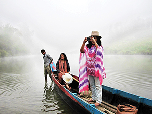 খুব ভোরে তল্পিতল্পা সাথে করে আমরা বেরিয়ে পড়লাম, সাধারণত এত ভোরে কোনো দোকান খোলে না, তাই আমাদের গাইড রাতেই একটি হোটেলে কথা বলে রেখেছিল, ভোরবেলা যেন নাসতার ব্যবস্থা করে রাখে। সেইমতো সব ঠিকঠাকই ছিল। আমরা নাসতা করে সরাসরি ঘাটে চলে গেলাম, যেখানে ইতোমধ্যে আগে থেকে ঠিক করে রাখা নৌকা হাজির। এখানেও একটি বিজিবি ক্যাম্প আছে, এখানে আমাদের পুনরায় বৃত্তান্ত দাখিল করতে হলো। অবশ্য, এখন এই দায়িত্ব আমাদের গার্ডই পালন করল। আধঘণ্টা সময় লাগল আনুষ্ঠানিকতা সেরে নিতে, এরপর শুরু হলো আমাদের অ্যাডভেঞ্চার- নাফাখুম। আমাদের আজকের যাত্রা নদীপথে। সাঙ্গু বা শঙ্খ যে-নামেই ডাকা হোক-না-কেন, কোনোটাই তার জন্য বেমানান নয়। প্রকৃতি যেন কুয়াশার চাদরে মোড়ানো। আমরা কুয়াশার চাদর একটু একটু করে সরিয়ে পথ চলতে শুরু করছি। ভোরের নরম আলোয় চলতি পথে নাকে লাগছে কচিপাতার মিষ্টি সুবাস, সেইসাথে পাহাড়ের নিজস্ব ছন্দ তো আছেই। বর্ষা শুরুর আগে নদীতে কোথাও কোথাও জল হাটু অব্দিও হবে না। কিছু দূর পরপর নৌকা থেকে নেমে হাঁটতে হচ্ছে। তাতে কিন্তু নৌভ্রমণের আনন্দ একটুও ম্লান হচ্ছে না। আস্তে আস্তে বেলা বাড়ছে, দৃশ্যপটও বদলে যাচ্ছে, আর আমরা উপভোগ করছি প্রকৃতির ভিন্ন ভিন্ন অপরূপ রূপ। কুয়াশার আবরণ চিরে ঝলমলে রোদ জানান দিচ্ছে সুয্যিমামা আমাদের সঙ্গী হয়েছে। নদীর দু’ধারে রং ছিটাচ্ছে নাম না-জানা বুনো ফুল, সাথে সঙ্গ দিচ্ছে পাহাড়ি কিশোরীর দিন যাপনের চঞ্চলতা। আমরা এগুচ্ছি, আর ছবি-বইয়ের এক একটি পাতা উল্টাচ্ছি। সত্যি যেন আমরা মর্ত্যরে বাইরে কোনো স্বপ্নের দেশে যাত্রা করেছি।